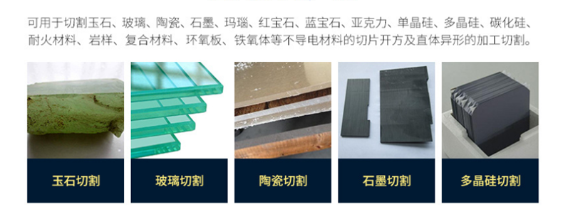 本加工方法是對(duì)電火花切割機(jī)床難以加工的不導(dǎo)電材料的補(bǔ)充。原則上對(duì)導(dǎo)電和不材料只要硬度比砂線小均可加工,對(duì)用電火花線切割機(jī)床加工難以加工的石墨材料,采用本產(chǎn)品加工尤能顯示其無(wú)比的優(yōu)越性;對(duì)脆性材料如注塑泡沫材料、復(fù)合材料、陶瓷、環(huán)氧板、鐵氧板、半導(dǎo)體材料、碳化硅、耐火磚、非導(dǎo)電材料等具有一定脆性材料的成型切割均可加工。